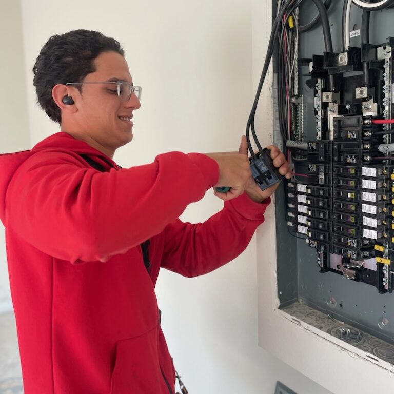 Through his contacts at Clay County Adult & Community Education, Martinez learned about opportunities with the Northeast Florida Builders Association (NEFBA) Apprenticeship Program. The four-year apprenticeship program offers training while students work full time with their employer and attend school to earn a trade license. Carpentry, Electrical, HVAC, Plumbing and Sheet Metal are the five trades that are being offered to students who have earned a high school diploma or GED. The program is 100% tuition-free. Martinez enrolled in the Electrical Apprenticeship program in June 2023.