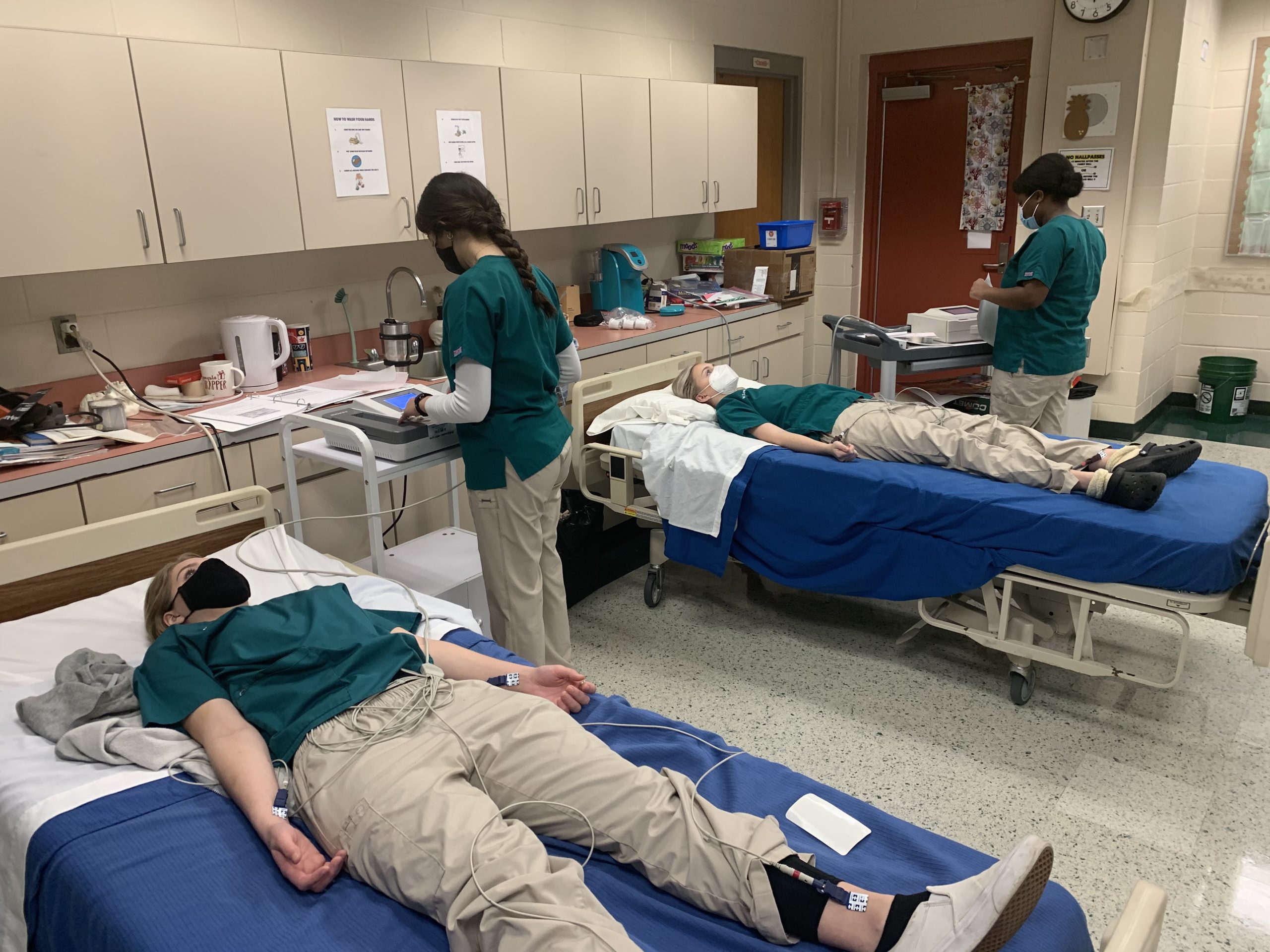As Mrs. Collins is an RN and Mrs. Dewberry is an EMT, they are constantly supplementing their instruction with real-world experience from the industry. RN’s and EMT’s approach their work very differently, as the scenario determines the response. Thus, students get a perspective from each teacher on how to respond to 12 patients needing continual care instead of 1 person needing emergency care.